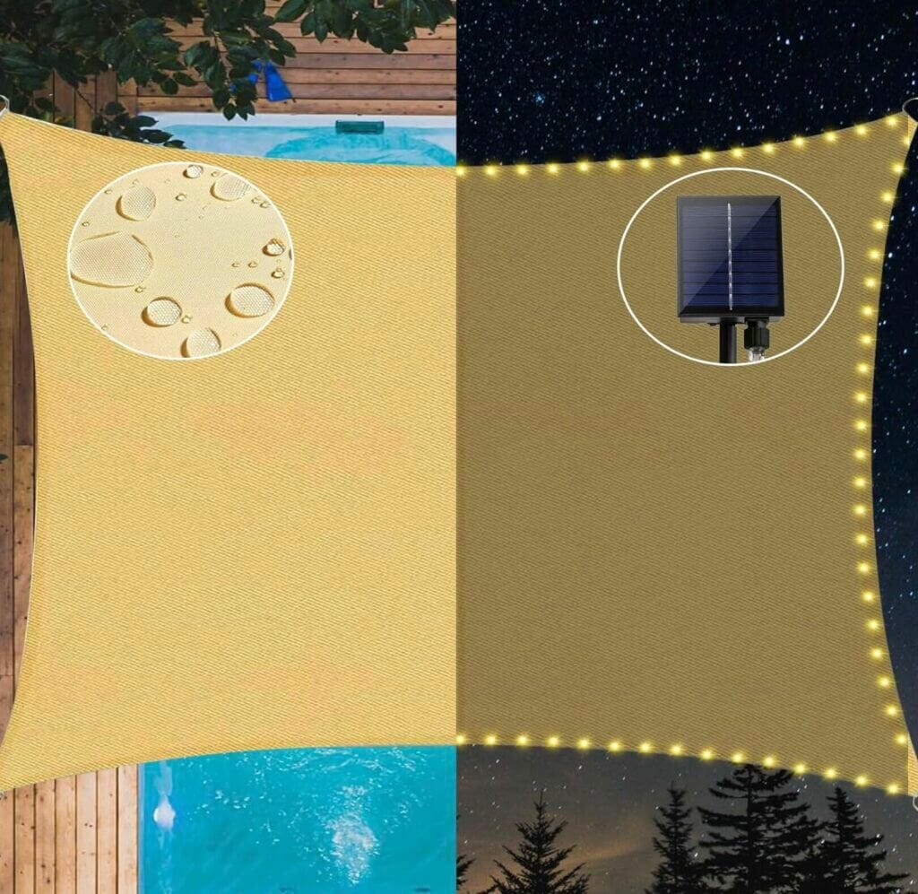 Die Besonderheit dieses Sonnensegels liegt in der eingebauten LED-Solar-Lichterkette, die durch Solarenergie betrieben wird. Dies sorgt für eine stimmungsvolle Beleuchtung bei Dämmerung und in der Nacht, ohne dabei zusätzliche Energiekosten zu verursachen. Die Lichterkette lädt sich tagsüber automatisch auf und bietet abends ein angenehmes Licht, ideal für gesellige Abende im Freien.