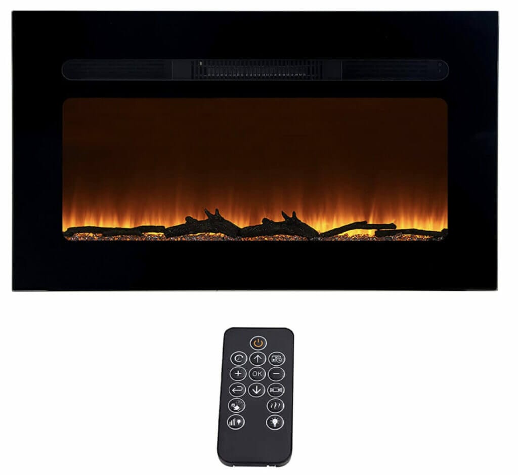 ALPHA CAMP Elektrischer Kamin mit integrierter Heizung zur Wandmontage. Der Kamin verfügt über 3 LED-Farben und 4 Flammeneffekte die mit der Touch-Fernbedienung eingestellt werden können.
