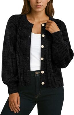 Die Strickjacke für Damen verbindet zeitlose Optik mit praktischer Vielseitigkeit.