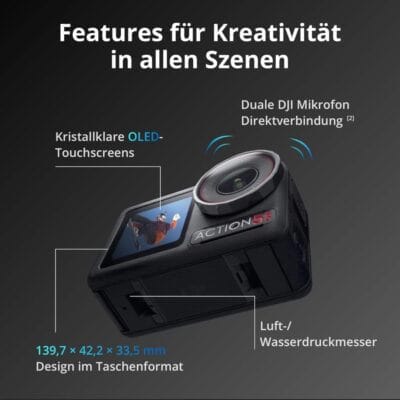 liefert gestochen scharfe 4K-Videos mit einem 1/1.3″-Sensor für beeindruckende Ergebnisse auch bei schwachem Licht. Zwei OLED-Touchscreens ermöglichen eine klare Bildvorschau und intuitive Bedienung. Mit drei Akkus bietet die Kamera bis zu 12 Stunden Aufnahmezeit und bleibt selbst unter Wasser bis zu 20 m zuverlässig einsetzbar. Dank 360° HorizonSteady bleiben Aufnahmen stabil – ideal für Sport, Reisen und Vlogs.