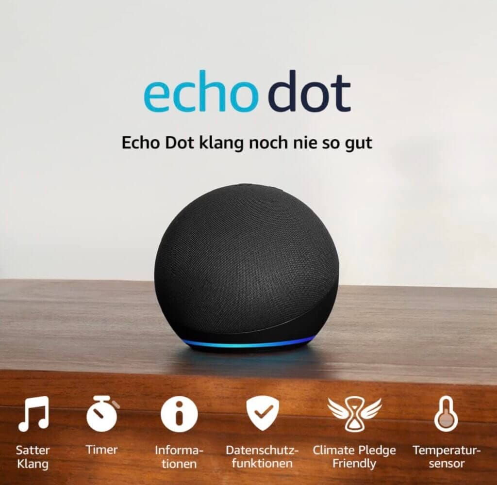Genieße klaren Klang und smarte Funktionen mit dem Echo Dot (5. Generation, 2022), dem Bluetooth Lautsprecher mit Alexa. Verwalte Dein Smart Home, spiele Deine Lieblingsmusik ab oder frage Alexa nach den neuesten Nachrichten – alles mit Deiner Stimme. Der Echo ist kompakt und in stilvollem Anthrazit gestaltet, was in jede Einrichtung passt. Nutze den Code ECHODOT und erhalte zwei Dots zum Preis von einem!