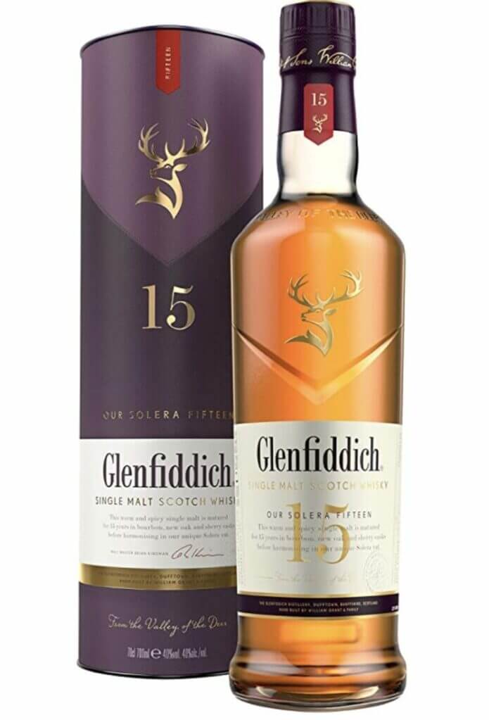 Der Glenfiddich Single Malt Scotch Whisky 15 Jahre Solera mit einer hochwertigen Geschenkverpackung. Der gute Tropfen kommt in einer 700ml Flasche.
