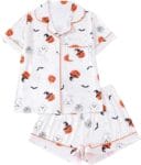 Der Halloween Schlafanzug für Damen besteht aus einem weichen, elastischen Material, das angenehm auf der Haut liegt und atmungsaktiv ist. Das Set aus kurzärmligem Shirt mit Knopfleiste und passender Shorts bietet Bewegungsfreiheit und eine bequeme Passform. Ein elastischer Bund mit Kordelzug und Seitentaschen sorgt für zusätzlichen Tragekomfort. Der verspielte Skelett- und Kürbisdruck macht den Zweiteiler ideal für Halloween, Karneval oder entspannte Abende zu Hause.