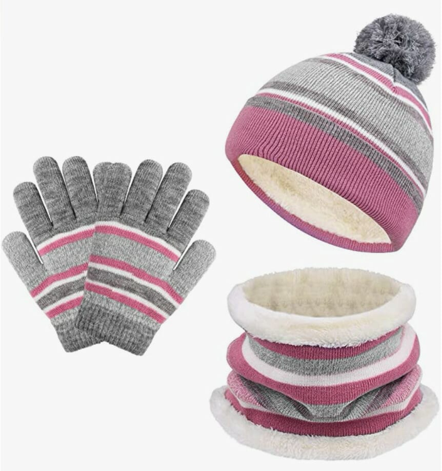 Ein komplettes Kinder Wintermütze, Schal und rutschfesten Touchscreen Handschuhe Set mit warmen Fleecefutter für Kinder von 5-10 Jahren. Es stehen verschiedene Farben zur Auswahl.