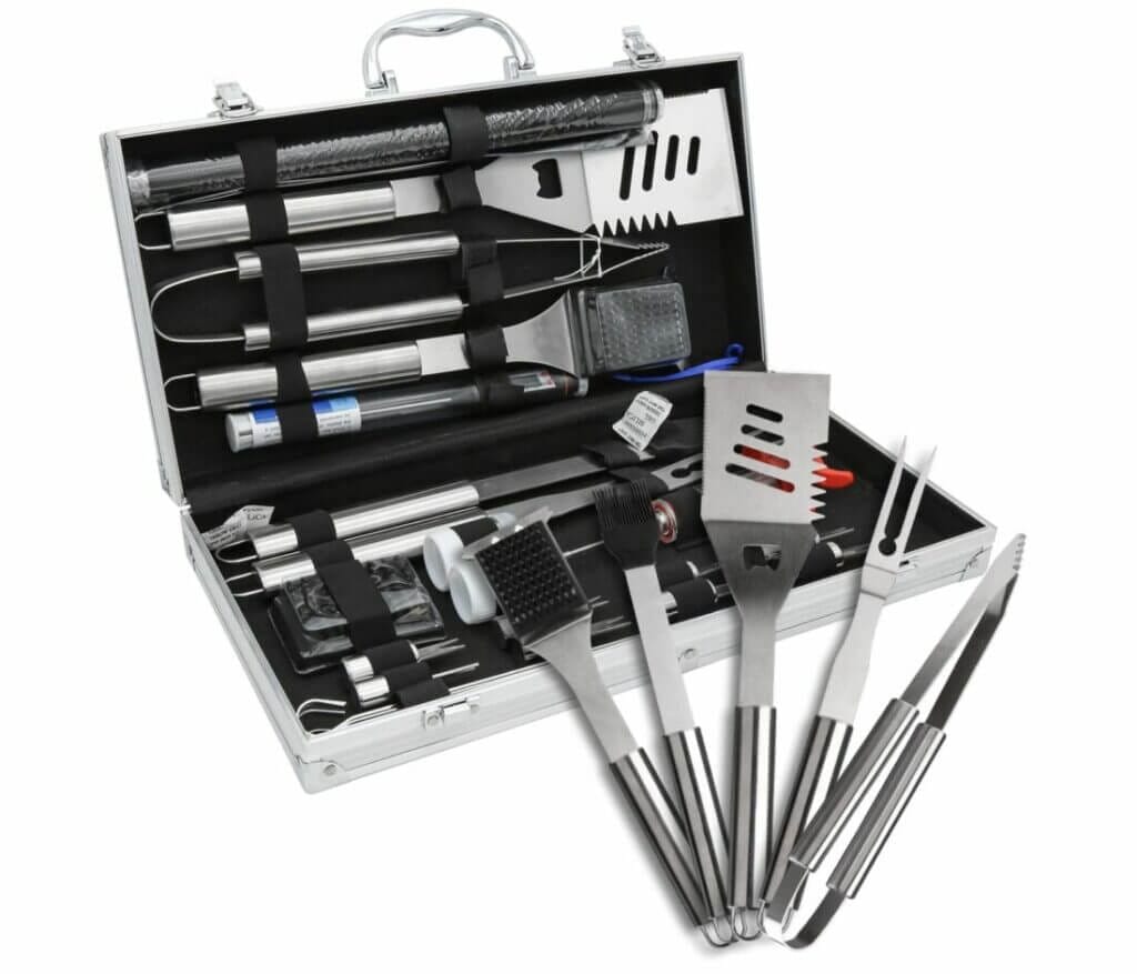Das Randaco BBQ Grillbesteck Set 25 Teilen. Es kommt in einem hochwertigen Aluminium-Koffer und hat von der Zange, über die Marinierspritze, bis hin zum Thermometer, alles was man zum Grillen brauch.