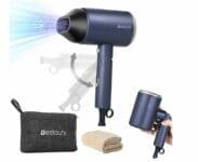 ist ein leistungsstarker 2000W-Haartrockner in einem kompakten, klappbaren Design, perfekt für unterwegs. Mit seiner Kaltlufttaste und der Stylingdüse ermöglicht er vielseitige Frisuren. Der Ionen-Föhn reduziert Frizz und sorgt für glänzendes Haar. Im Lieferumfang ist eine praktische Filz-Aufbewahrungstasche und ein Kopfhandtuch enthalten. Dieser Reisehaartrockner in Blaugold kombiniert Stil und Funktionalität und ist ein Must-Have für unterwegs.