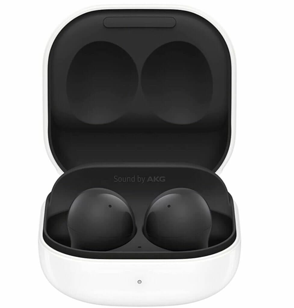 Die Samsung Galaxy Buds 2, Kabellose Kopfhörer, mit Geräuschunterdrückung (ANC) und einem ausdauernden Akku. Die Kopfhörer haben 3 Mikrofone, inkl. Araree Nukin Clear Cover, in der Farbe Graphite.