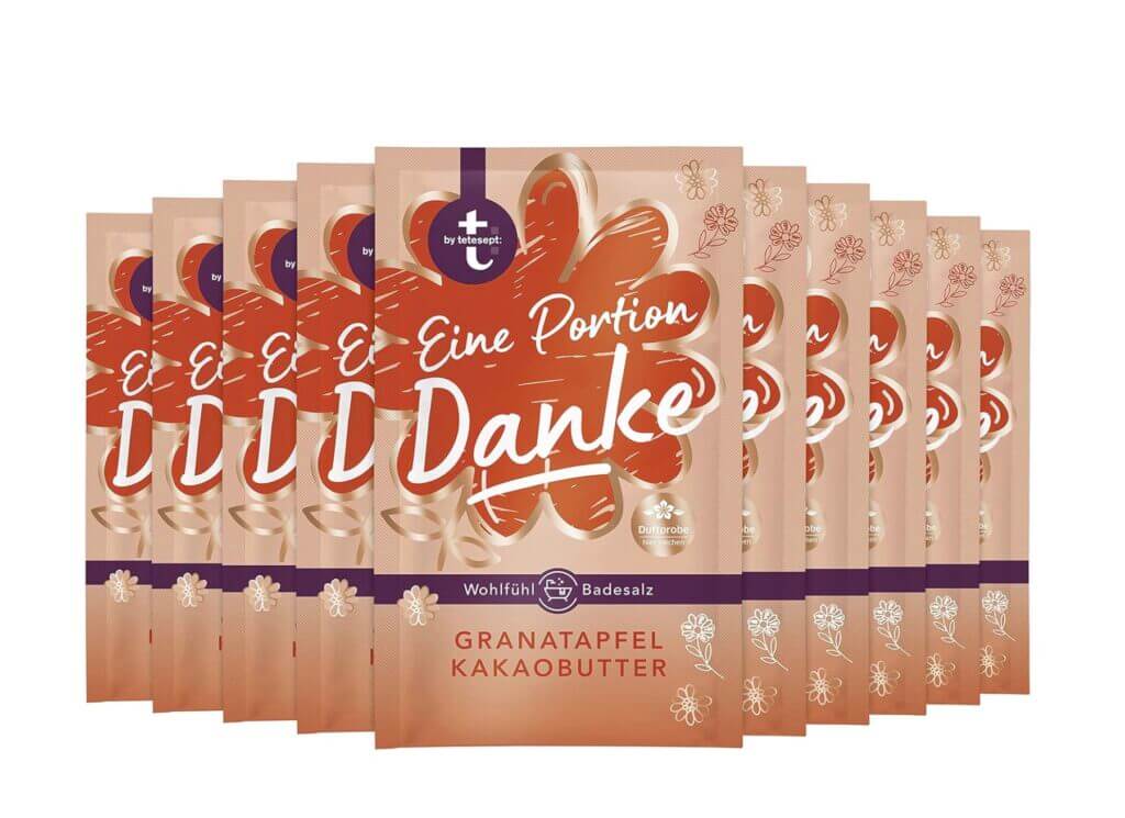 Im Lieferumfang enthalten sind 10 Packungen à 60 g des Salzes „Eine Portion Danke“, ideal zum Verschenken oder als Vorrat für viele erholsame Badeerlebnisse. Das Badesalz kommt ohne Konservierungsstoffe, Alkaliseife, Paraffine, Silikone und Mineralöle aus, was die Natürlichkeit und Hochwertigkeit des Produkts unterstreicht.