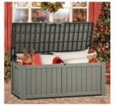 Die Konstruktion aus hochwertigem, wetterfestem Kunststoff sorgt für eine lange Lebensdauer. Regen, Schnee oder direkte Sonneneinstrahlung machen der robusten Aufbewahrungsbox nichts aus. Dank der Belüftungsöffnungen bleibt der Inhalt trocken und gut durchlüftet. Die Box lässt sich mit einem Vorhängeschloss (nicht enthalten) abschließen und bietet damit zusätzlichen Schutz für deine Gartenutensilien.